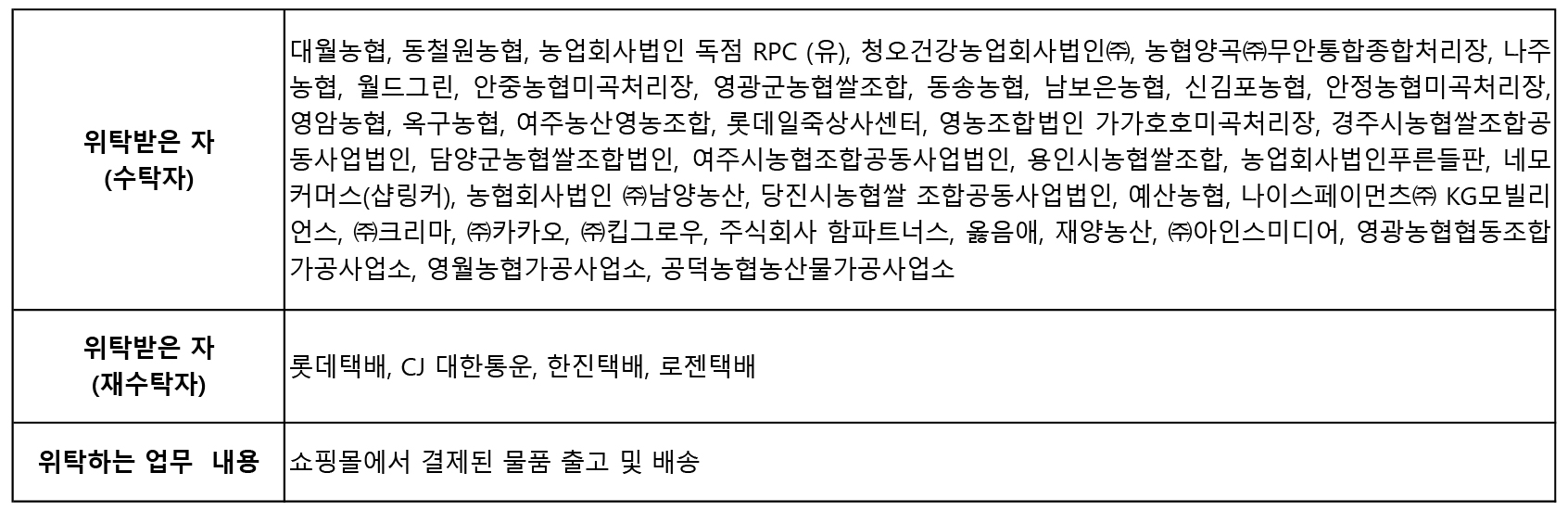 - 5. 개인정보 위탁사 추가: ㈜남양농산, 당진시농협쌀 조합공동사업법인, 예산농협, 나이스페이먼츠㈜ KG모빌리언스, ㈜크리마, ㈜카카오, ㈜킵그로우, 주식회사 함파트너스